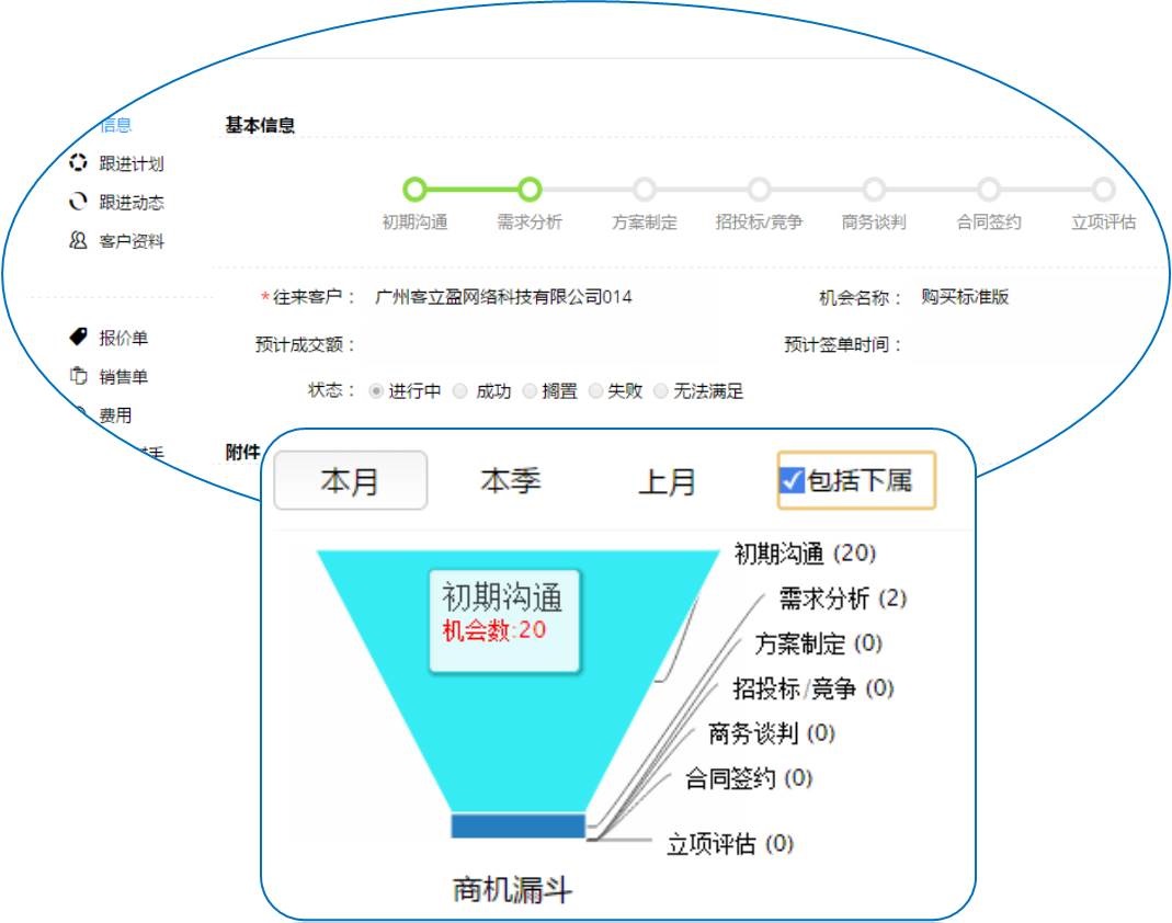 精细化管理销售过程,全程跟踪线索和商机,细化销售阶段,实时跟进,促进客户签单,实现1对1精准营销;