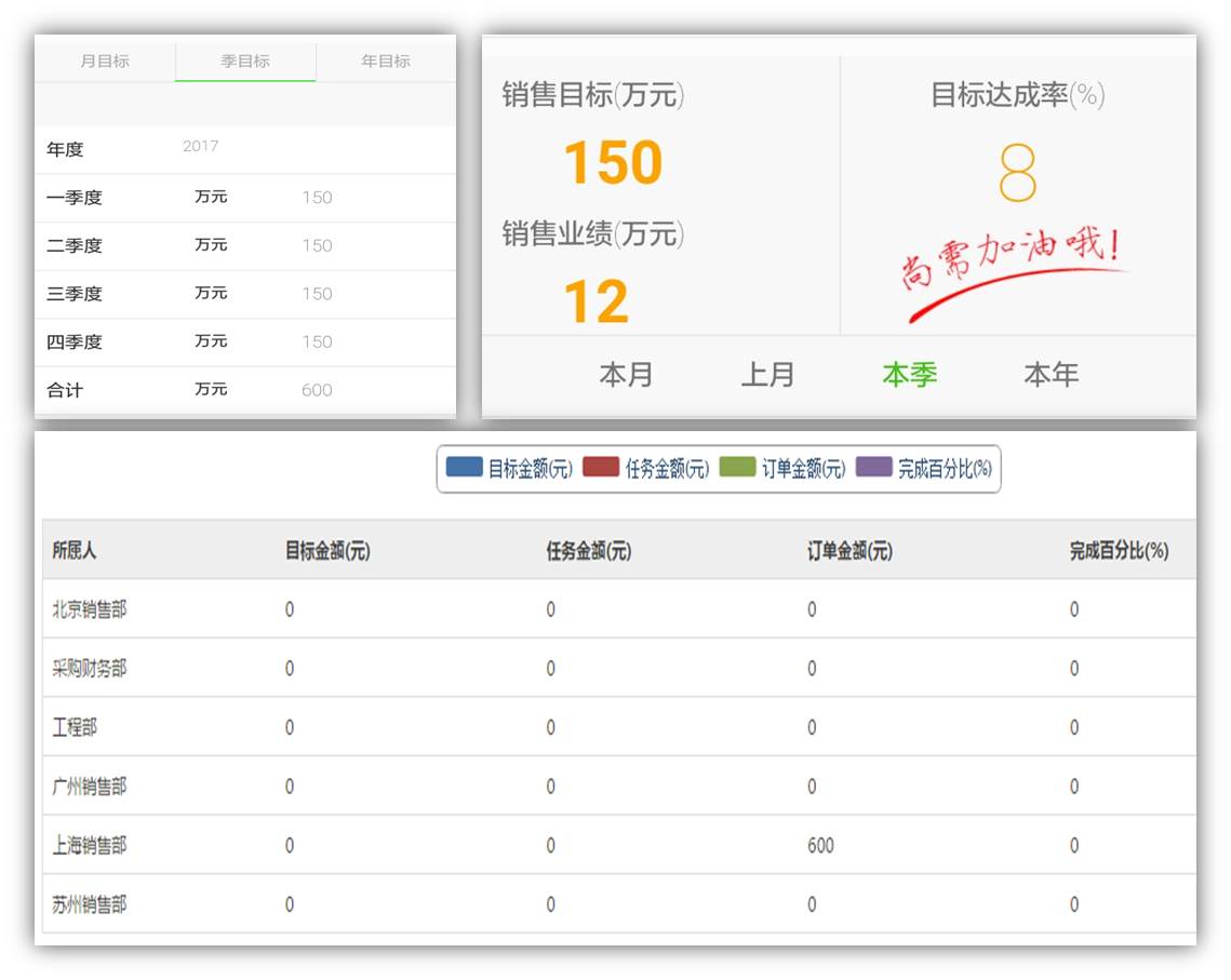 客立盈CRM,可以依据年度、季度、月度进行销售目标制定,实时追踪目标完成情况;