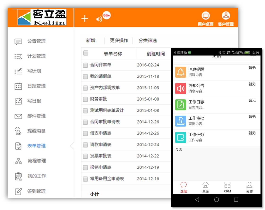 客立盈CRM,提供基础的协同办公平台,避免营销人员在使用CRM的同时还需要使用OA系统;